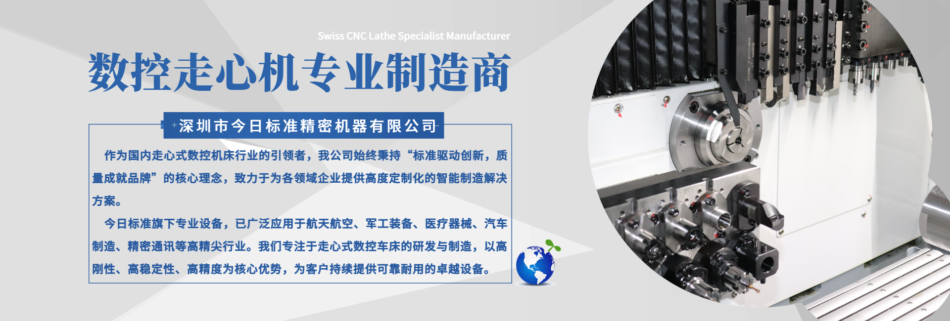 深圳市今日標(biāo)準(zhǔn)精密機(jī)器有限公司成立于2007年,經(jīng)過多年的蓬勃發(fā)展,已經(jīng)成為集走心式數(shù)控車床研發(fā)、生產(chǎn)、銷售、服務(wù)于一體的國家高新技術(shù)企業(yè)。